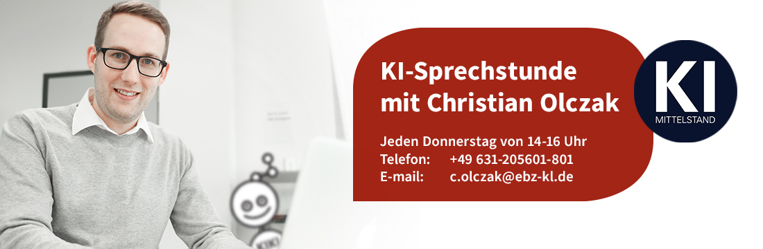 Der Ansprechpartner für das Thema KI beim Mittelstand 4.0-Kompetenzzentrum Planen und Bauen ist Christian Olczak, Sie erreichen ihn auch unter der Telefonnummer +49 631-205601-801.
