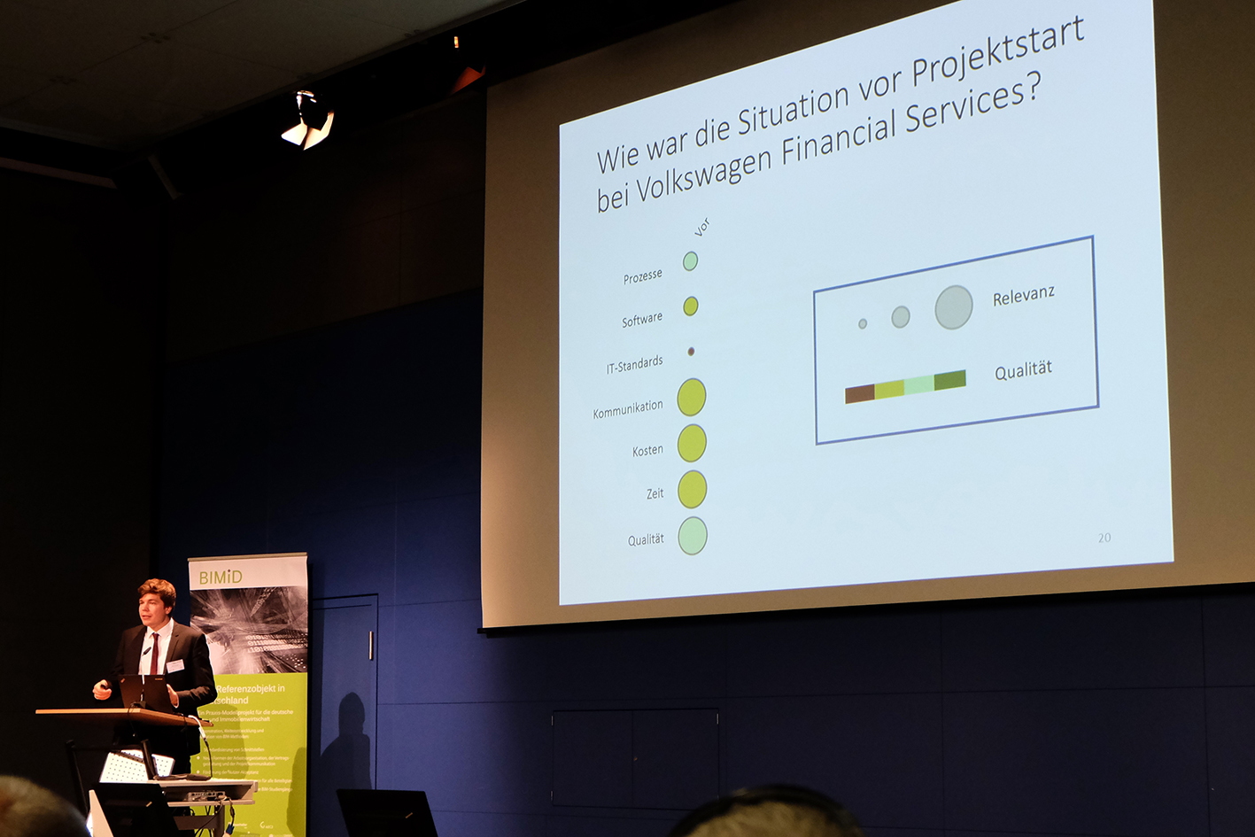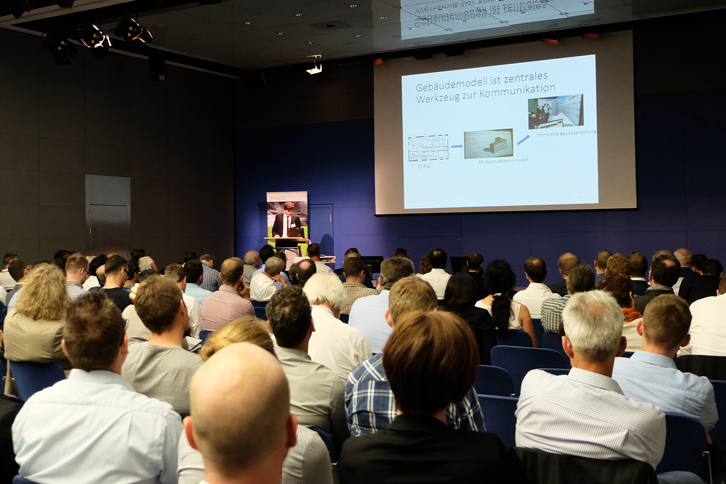 Bereits in der Begrüßungsrede brachte Prof. Dr. Klaus Peter Sedlbauer, Leiter des Fraunhofer-Instituts für Bauphysik IBP, die Erwartungen an Building Information Modeling auf den Punkt: Gebäude werden durch BIM besser werden! Mit besonders großem Interesse wurde daher das erste Zwischenfazit von Volkswagen Financial Services AG (VWFS), dem Bauherrn des Bürogebäudes in Braunschweig, sowie die Zwischenergebnisse des mit der sozialwissenschaftlichen Begleitforschung befassten Instituts für Mittelstandsforschung (ifm) der Universität Mannheim erwartet.